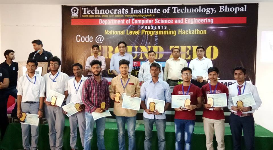 National Level Hackathon, code@groundzero,Department of Computer Science and Engineering, Technocrats Institute of Technology organized final round of National Hackathon code@groundzero. The 9 Hr nonstop programming event comprised of code development for 32 problems per team, tech talks and rejuvenating music too. Hackathon was designed to inspire the creative and dynamic technophiles to put their skills to test, thereby identifying and rewarding the tech wizards. Highlight of event was in house developed web portal http://codeatgroundzero.in by SIH 2017 runner-up team.