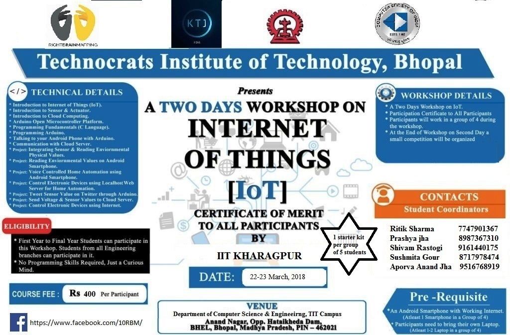 A TWO DAYS workshop on INTERNET OF THINGS [IoT] certificate of merit to all participants by IIT KHARAGPUR Date : 22-23/ march/2018